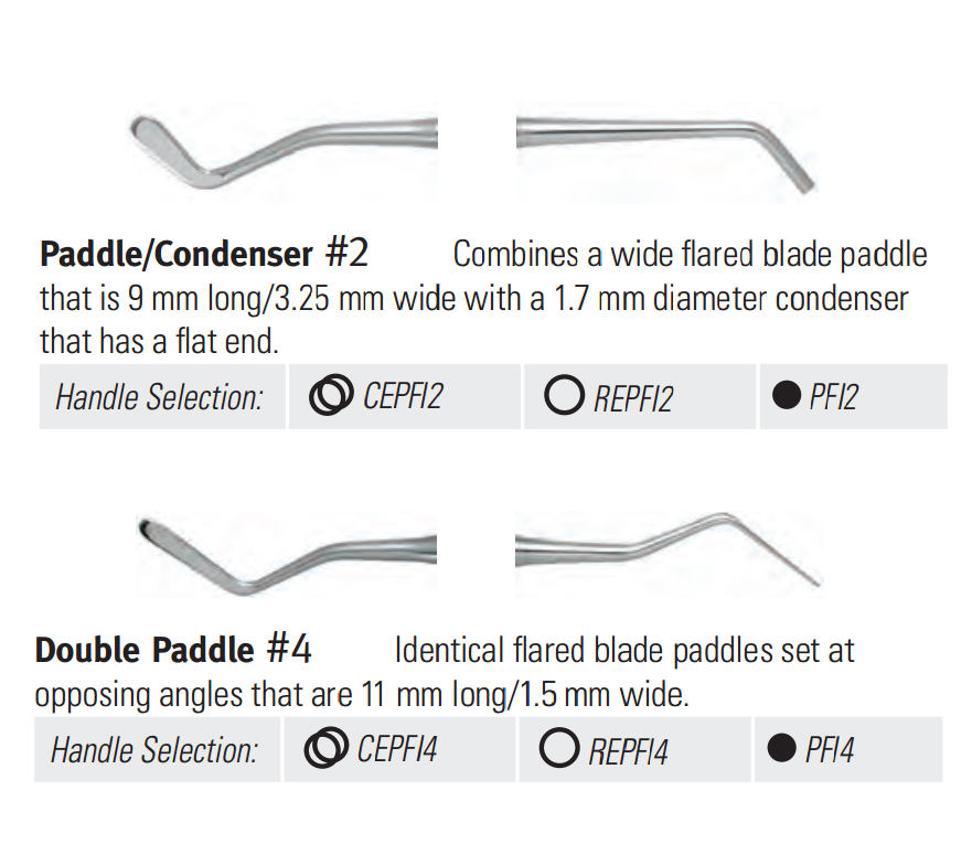 Paddle/Condenser #2 Combines a wide flared blade paddle that is 9 mm long/3.25 mm wide with a 1.7 mm diameter condenser that has a flat end.