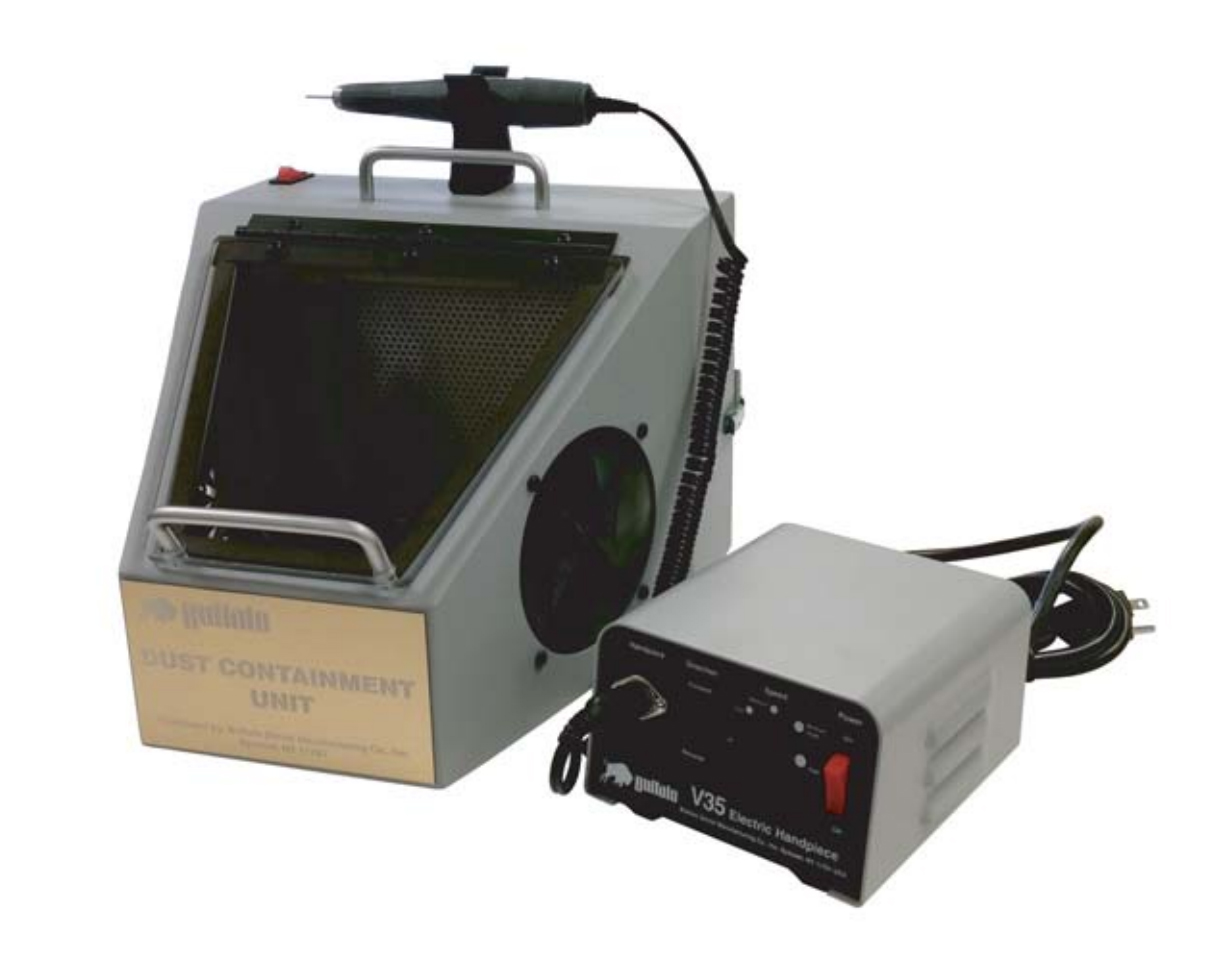 Enhance safety for you and your assistant's with the new Buffalo Dental Manufacturing Dust Containment Unit. The D.C.U for short, is an enclosed unit featuring an internal light, suction fan and filter system that will allow you to use the supplied handpiece in a more sanitary and safe environment.
