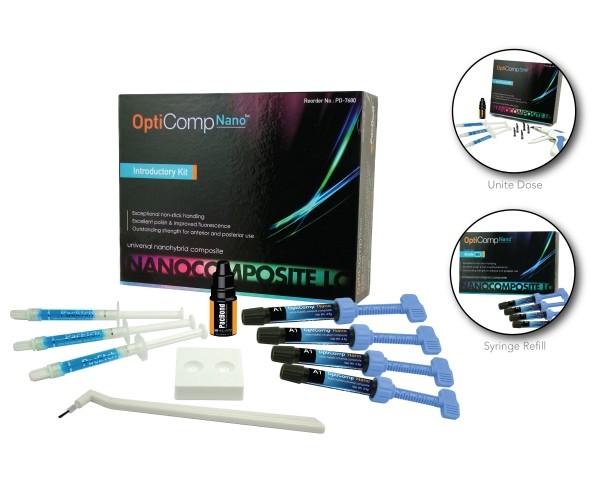 PD-7680U OptiComp Nano Unit Dose Kit; Contents: 1x7ml PacBond, 2-well mixing wells, 20x etching tips, 1xbrush tip, 1xbrush tip handle, 1xmixing pad, 3x 1.2cc PacEtch etching gel, 80x0.2gm capsules, 20 of each shade A1, A2, A3, and B1 and 1xProJect dispensing gun.